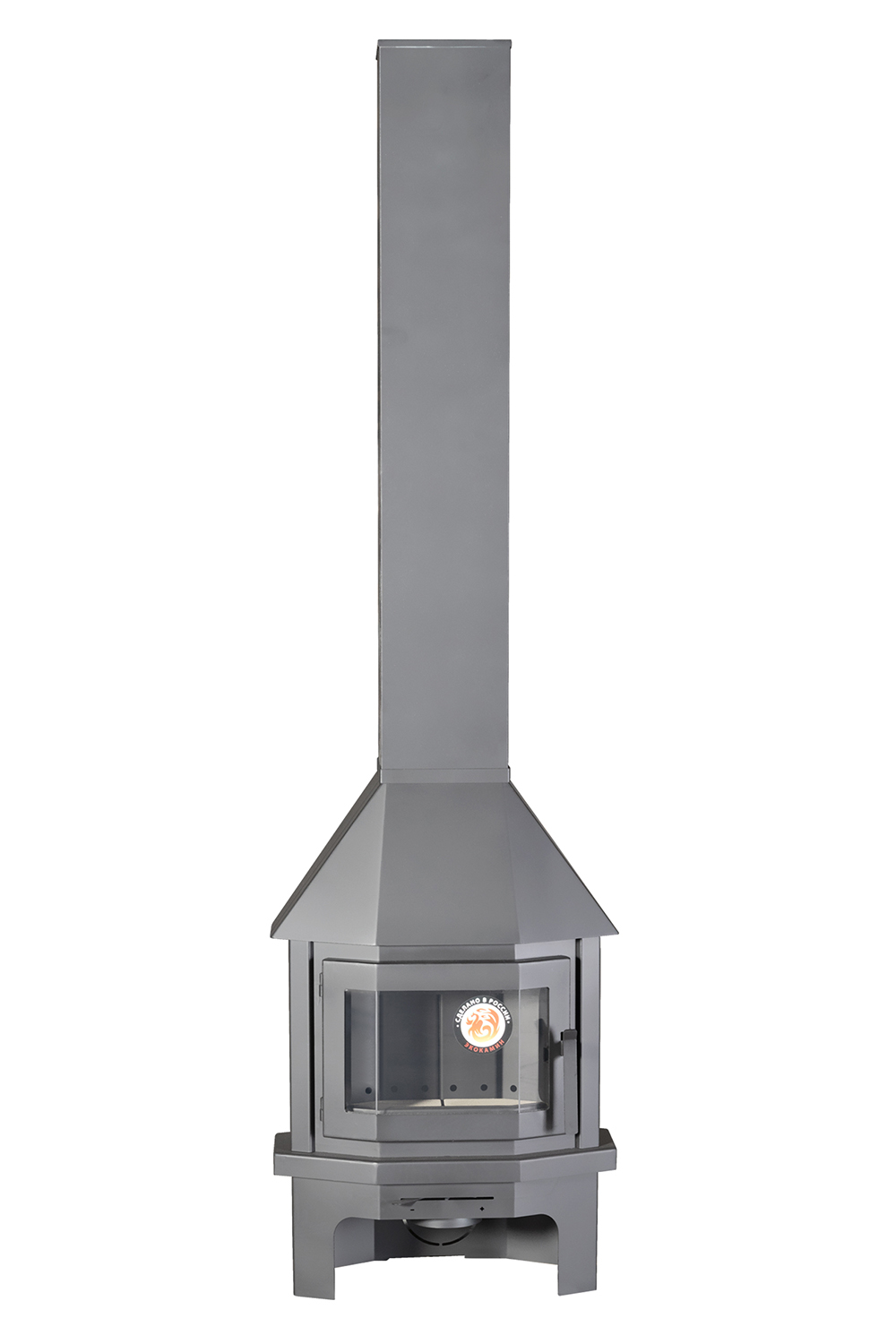 Система подключения дымохода сверху обеспечивает эффективное удаление дымовых газов, а конструкция камеры двойного сгорания обеспечивает высокий КПД в 80%. Габариты камина (ВхШхГ) составляют 2147х600х334 мм, а вес - 64 кг.